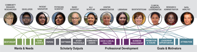This project encompasses and describes the diversity of roles in the clinical and translational science ecosystem. By identifying CTS roles, establishing a persona to represent each role, and providing each persona with a profile, we have documented the needs, motivations, goals, and pain points in the translational workforce that can be used to inform software development, use cases, teaching materials, and more for the CTSA community.